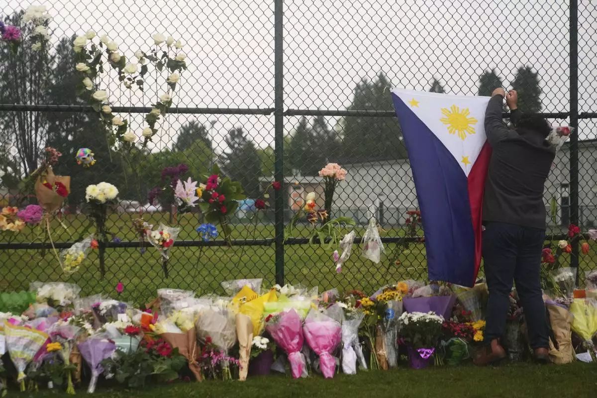 Stiv Jimenez hangs a Philippines flag at a memorial for victims after a vehicle drove into a crowd during a Filipino heritage festival in Vancouver, British Columbia, Monday, April 28, 2025. (AP Photo/Lindsey Wasson)