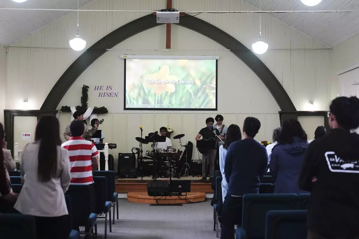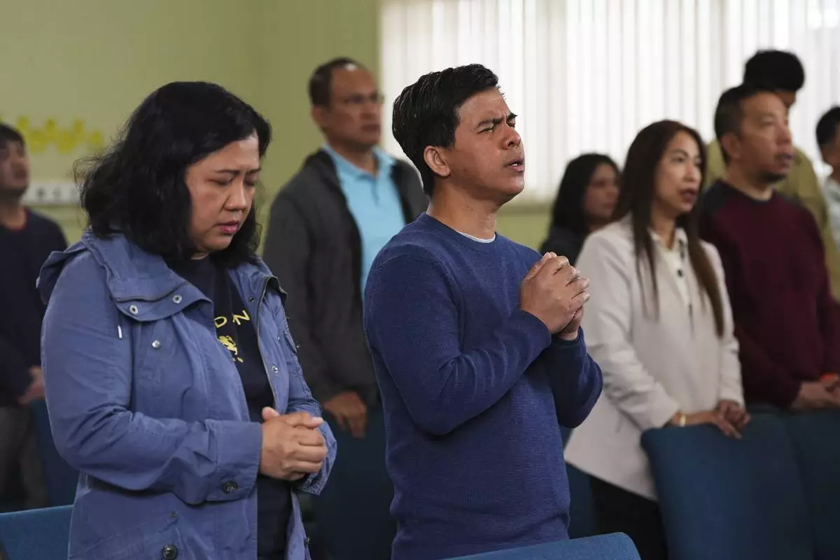 People sing at the end of a service at the Filipino Fellowship Baptist Church the day after a driver killed multiple people during a Filipino community festival Sunday, April 27, 2025, in Vancouver, British Columbia. (AP Photo/Lindsey Wasson)