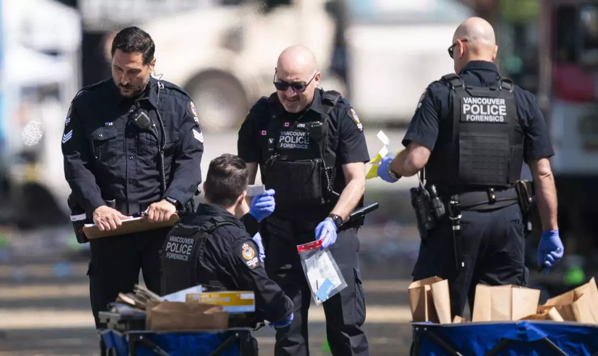 Members of the Vancouver Police forensics examine the evidence while investigating the scene where a vehicle drove into crowd at a street festival, in Vancouver, British Columbia, Sunday, April 27, 2025. (Rich Lam/The Canadian Press via AP)