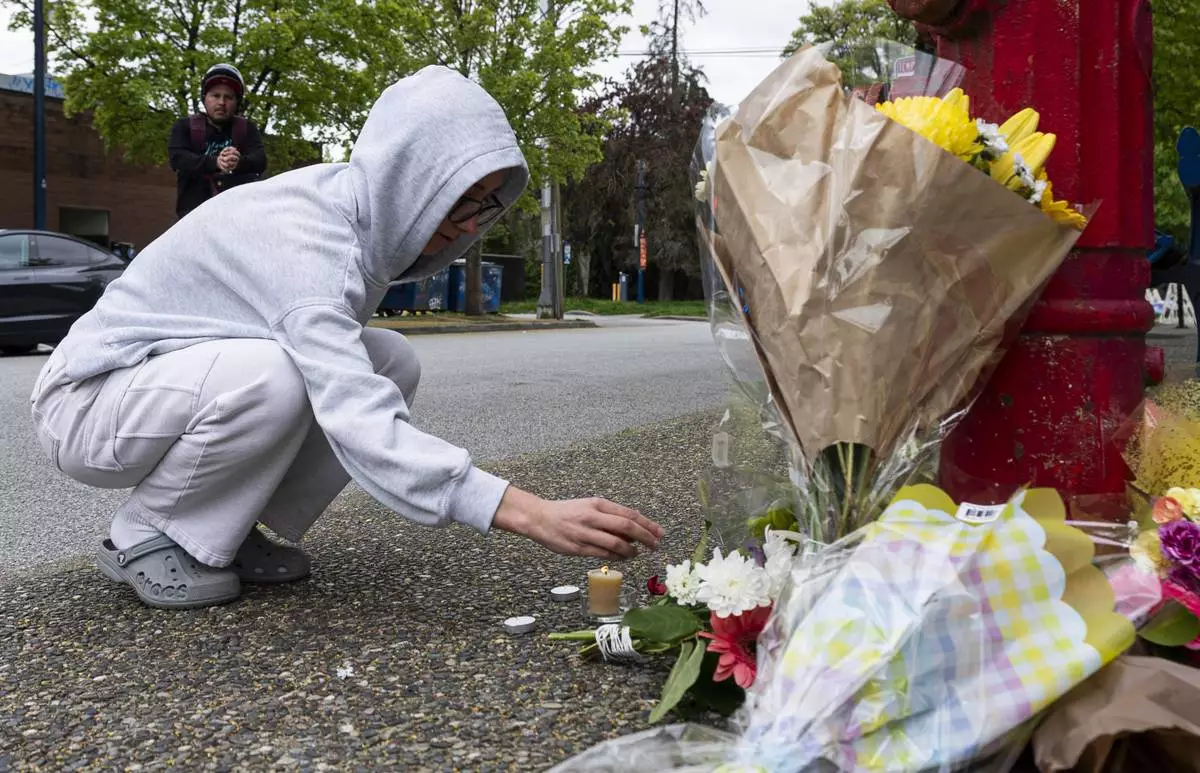 A woman lays flowers at a memorial during a vigil on a provincial day of mourning for the victims of the vehicle-ramming attack at the Filipino community's Lapu Lapu Day festival last week in Vancouver, on Friday, May 2, 2025. (Darryl Dyck/The Canadian Press via AP)