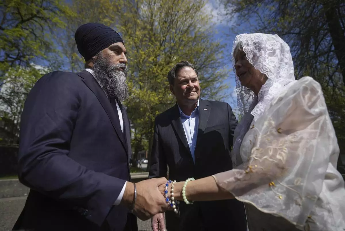 NDP Leader Jagmeet Singh talks with Rosita Taruc, right, as NDP candidate for Vancouver Kingsway Don Davies, back centre, listens as they arrive to attend mass at St. Mary's Parish after multiple people that were stuck by a car were killed at a Filipino heritage festival, in Vancouver, British Columbia, Sunday, April 27, 2025. (Darryl Dyck/The Canadian Press via AP)