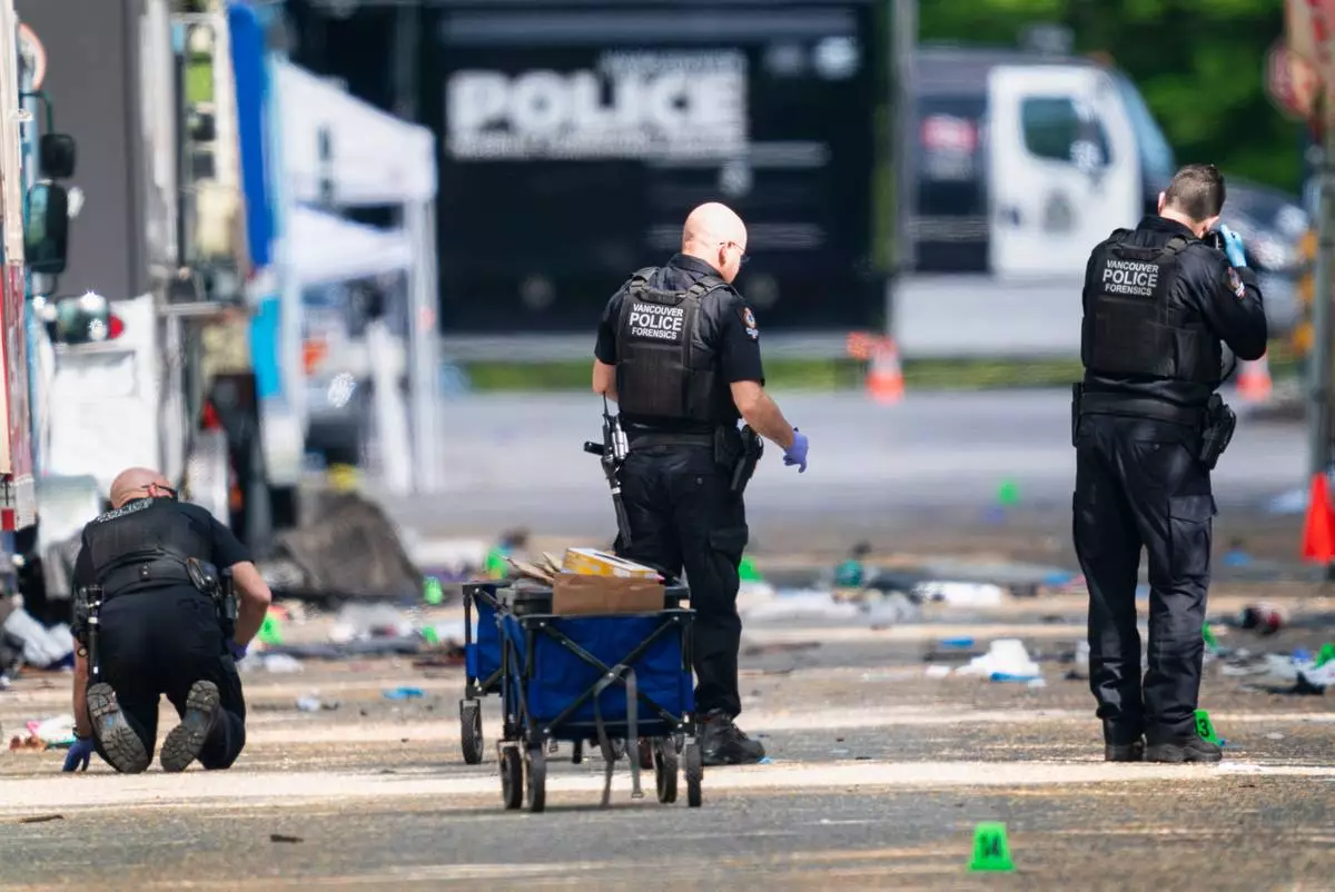 Vancouver Police survey the scene after a driver killed multiple people Saturday during a Filipino community festival Sunday, April 27, 2025, in Vancouver, British Columbia. (AP Photo/Lindsey Wasson)