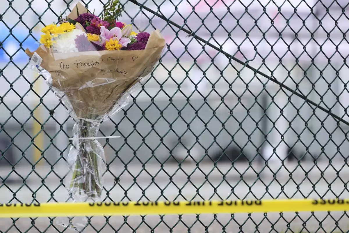 A bouquet of flowers is seen attached to a nearby fence the day after a driver killed multiple people during a Filipino community festival Sunday, April 27, 2025, in Vancouver, British Columbia. (AP Photo/Lindsey Wasson)