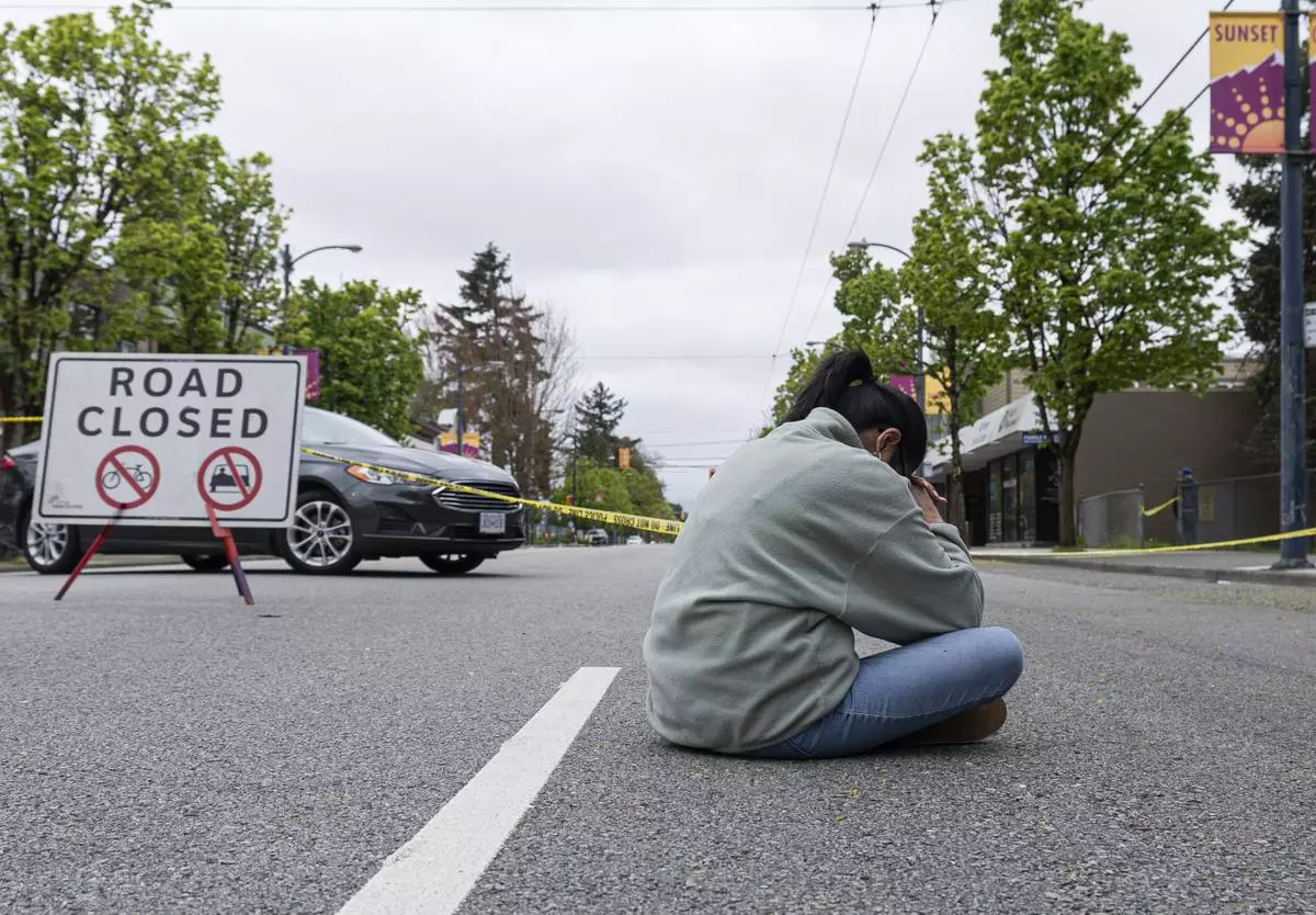 A woman sits and prays near the site where a vehicle drove into crowd at a street festival last night killing multiple people in Vancouver, British Columbia, Sunday, April 27, 2025. (Rich Lam/The Canadian Press via AP)