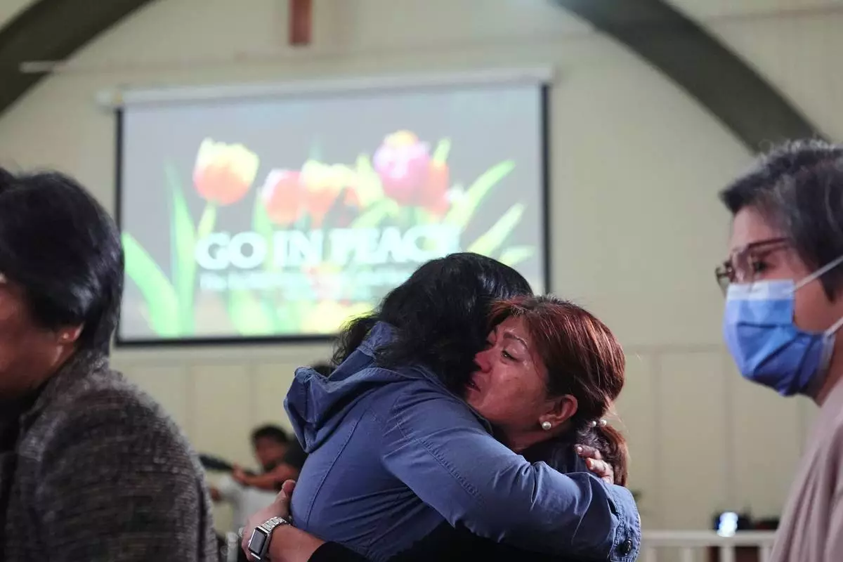 Congregants embrace after a worship service at the Filipino Fellowship Baptist Church in Vancouver, Canada, Sunday, April 27, 2025, the day after a driver killed multiple people at a Filipino community festival. (AP Photo/Lindsey Wasson)