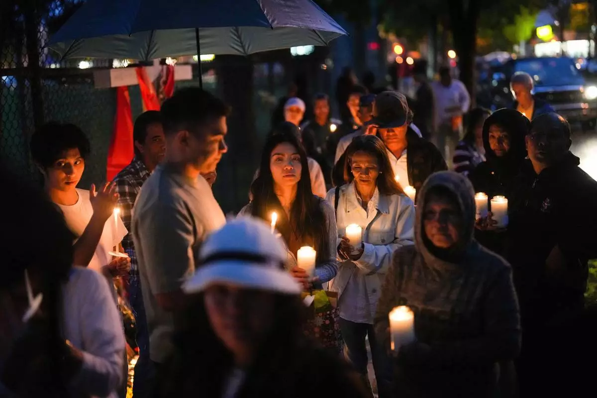 People gather for a candlelight march during a vigil on the street where a vehicle-ramming attack occurred at the Filipino community's Lapu Lapu Day festival last week, on a provincial day of mourning for the victims,, in Vancouver, on Friday, May 2, 2025. (Darryl Dyck/The Canadian Press via AP)