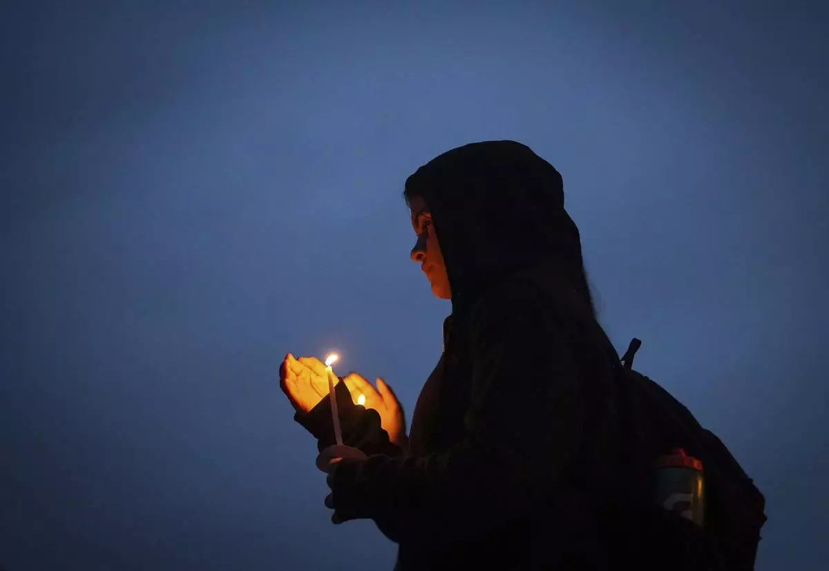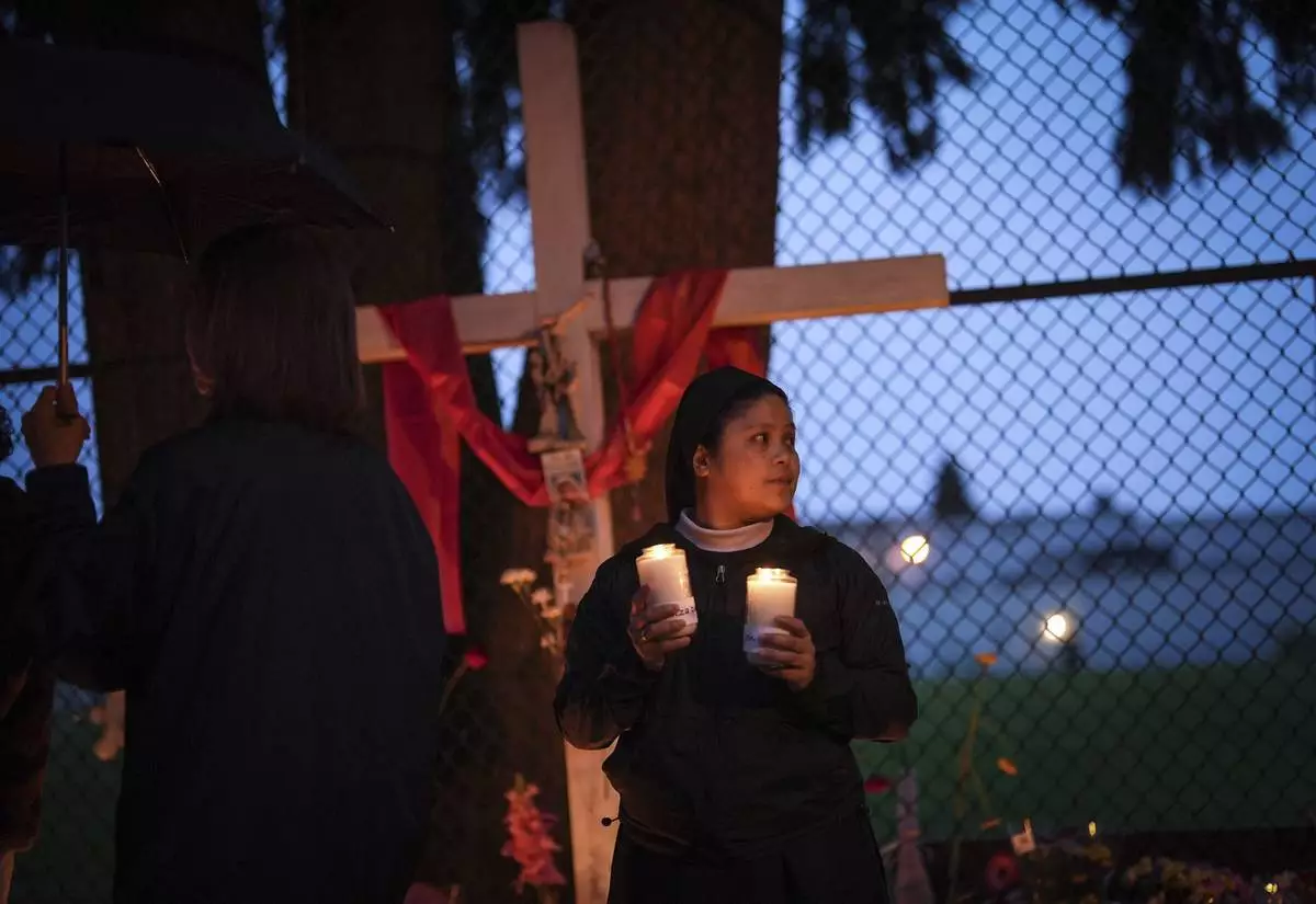 A nun holds candles as people gather for a candlelight march during a vigil on the street where a vehicle-ramming attack occurred at the Filipino community's Lapu Lapu Day festival last week, on a provincial day of mourning for the victims, in Vancouver, on Friday, May 2, 2025. (Darryl Dyck/The Canadian Press via AP)