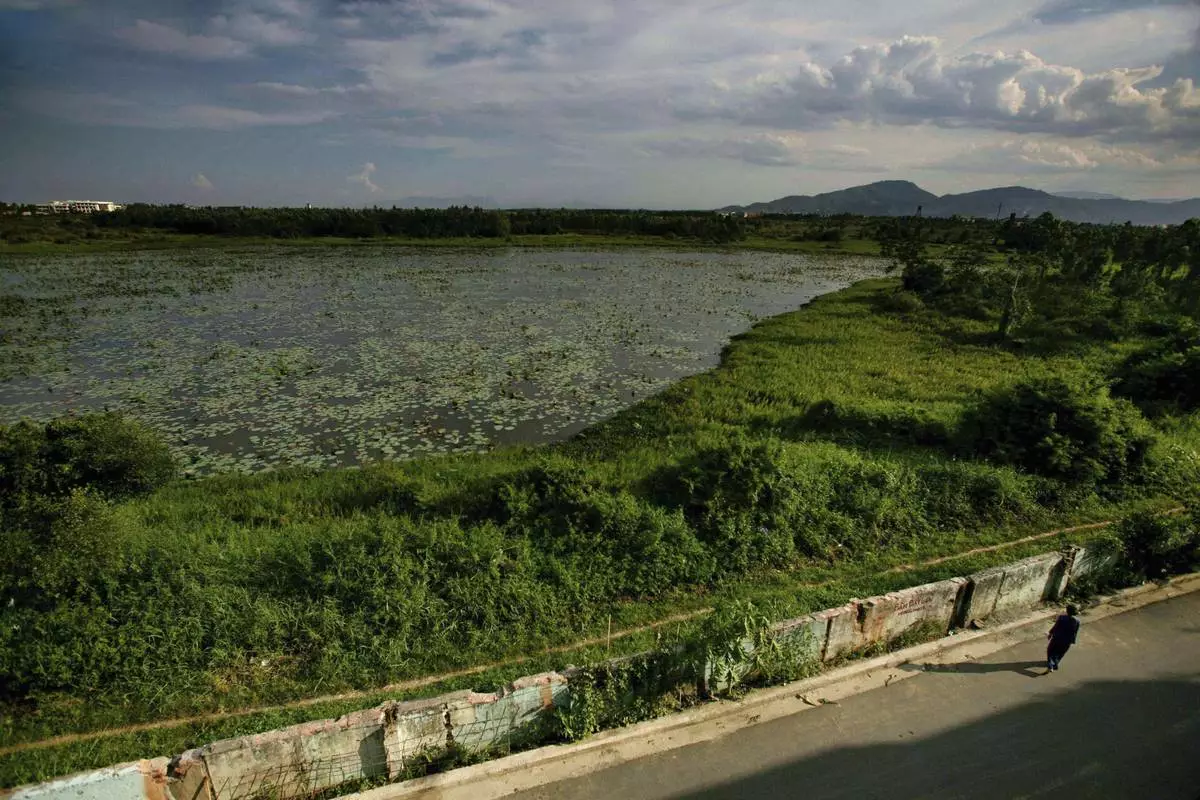 FILE -A woman walks next to a highly contaminated pond around the grounds of the Danang airbase in Danang, Vietnam, May 21, 2007. (AP Photo/David Guttenfelder, File)