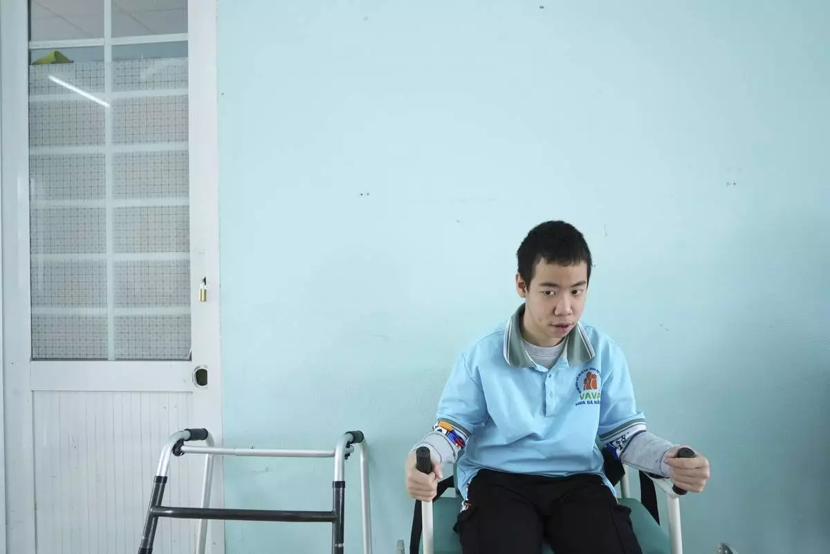 Nguyen Ba Quy Phuoc, 14, attends a physiotherapy class at a school for victims of Agent Orange in Da Nang, Vietnam, March 7, 2025. (AP Photo/Hau Dinh)
