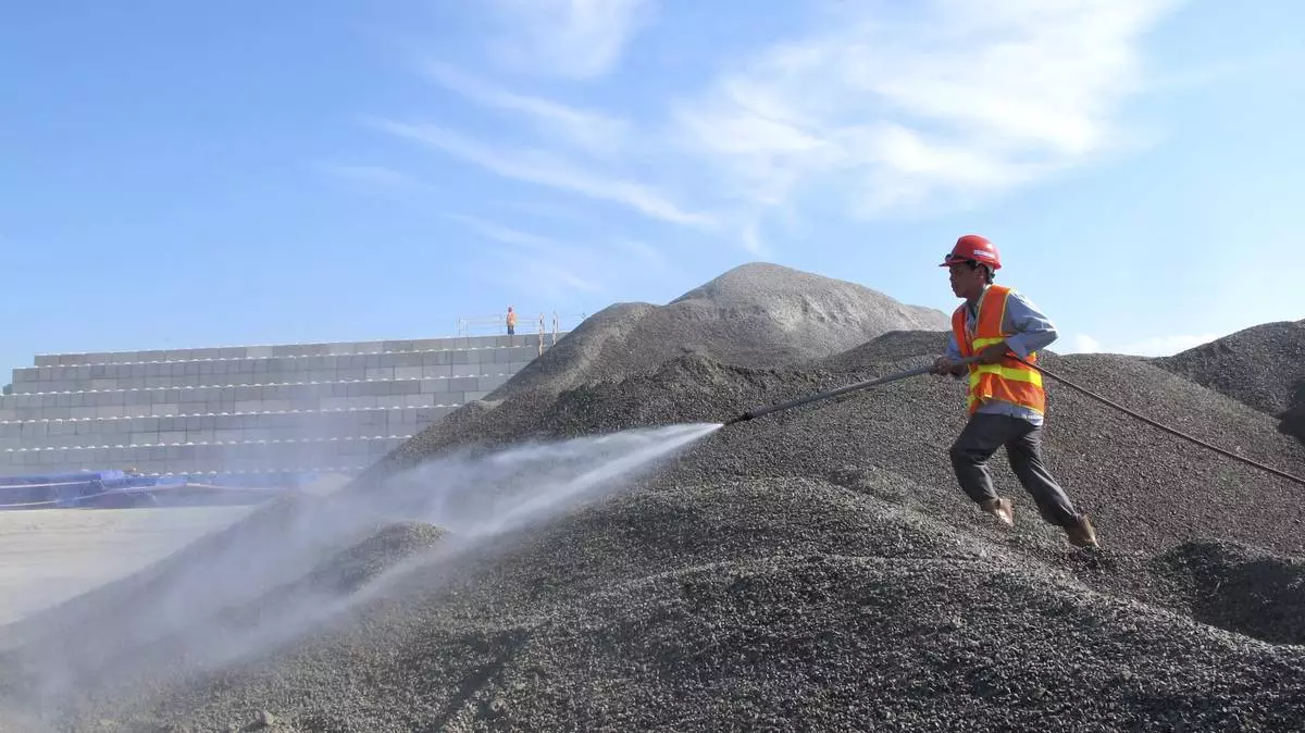 FILE- A Vietnamese worker sprays water over stones to be used in the construction of a silo for storing soil contaminated with Agent Orange dioxide at the site of a former American airbase in Danang, Vietnam on Wednesday, April 24, 2013. (AP Photo/Hau Dinh, File)