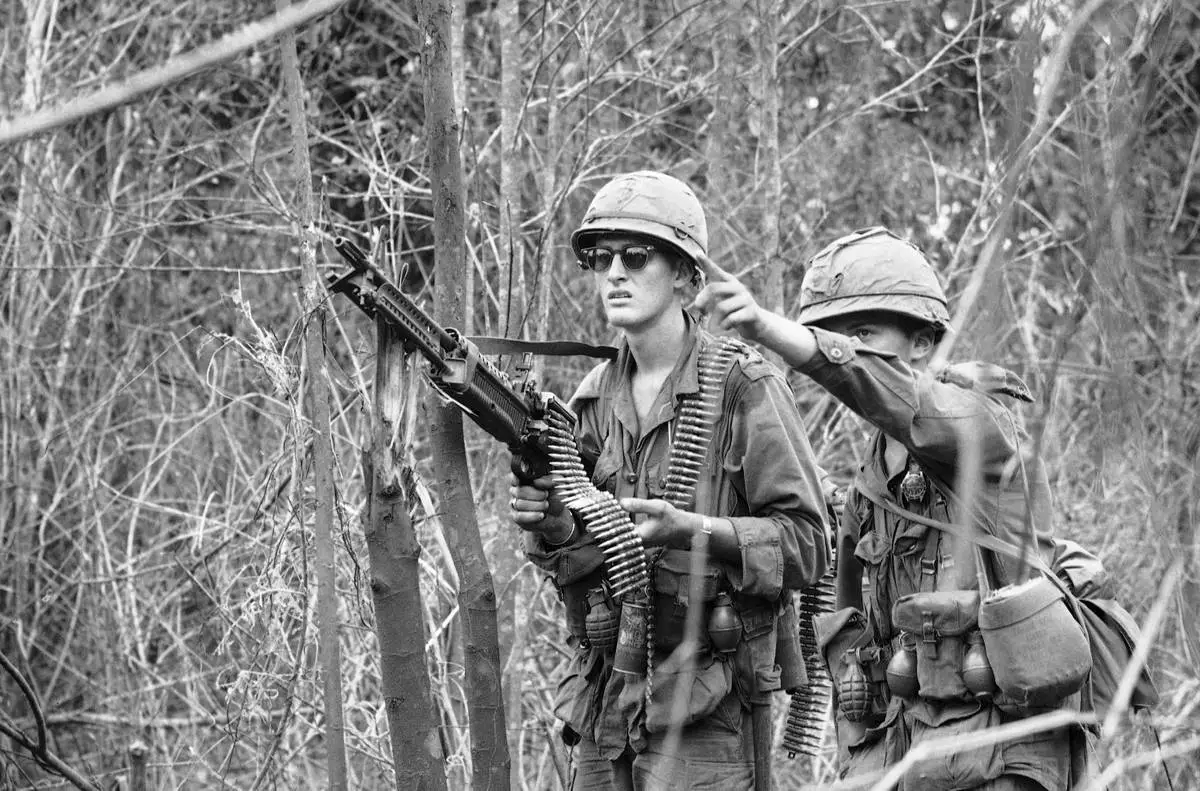 FILE- Infantryman points out a suspicious shadow in a tree to his machine gunner as they move on patrol near the Cambodian Border west of Pleiku in Vietnam on Nov. 26, 1966. Troops of the 25th Infantry Division (1st Battn. 14th Inf.) inches through the thick jungle from their base camp after being held up three days by snipers. AP Photo/Horst Faas, File)