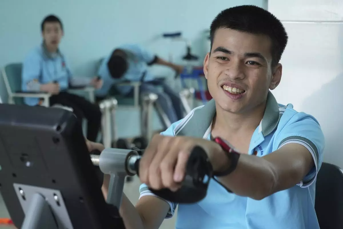 Truong Minh Phu, 20, practices with an arm pedal exerciser in physiotherapy class at a school for victims of Agent Orange in Da Nang, Vietnam, March 7, 2025. (AP Photo/Hau Dinh)