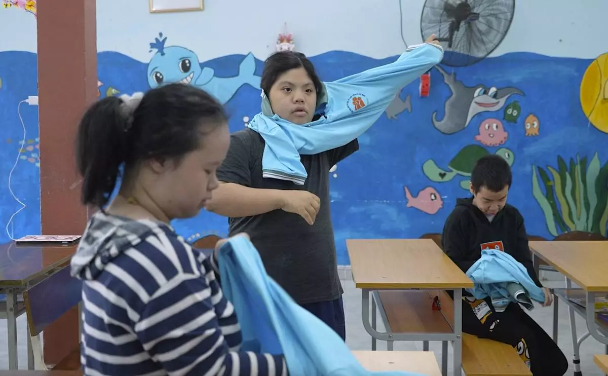 Students put on uniforms at a school for victims of Agent Orange in Da Nang, Vietnam, March 7, 2025. (AP Photo/Hau Dinh)