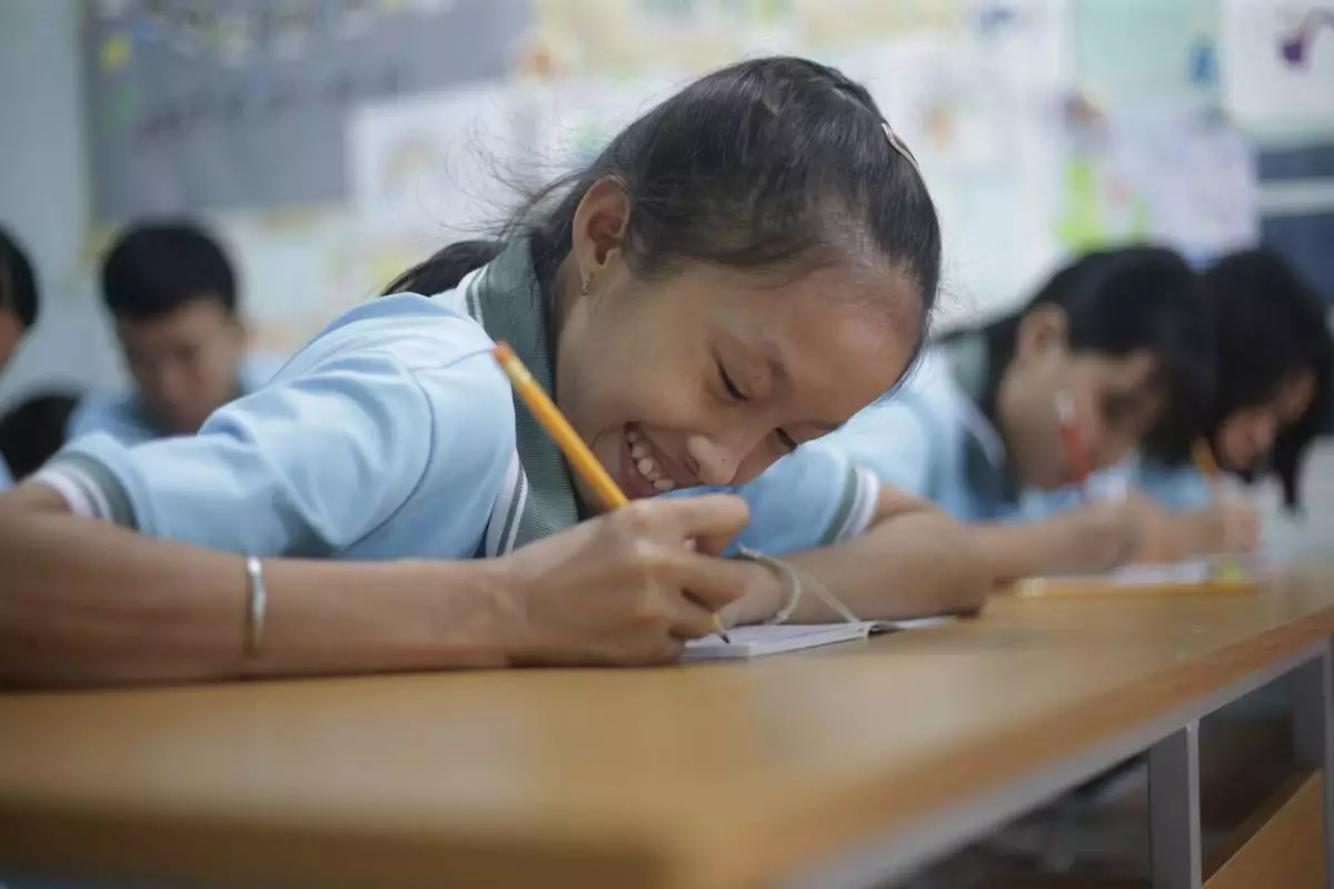 Nguyen Khanh Vy, 19, smiles while writing in her book at a school for victims of Agent Orange in Da Nang, Vietnam, March 7, 2025. (AP Photo/Aniruddha Ghosal)
