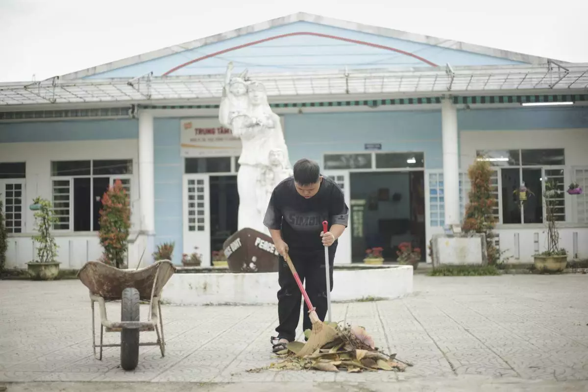 A student sweeps the area in front of a school for victims of Agent Orange in Da Nang, Vietnam, March 7, 2025. (AP Photo/Aniruddha Ghosal)