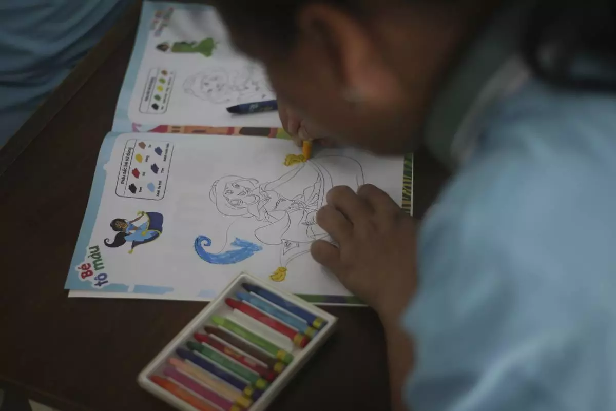 A student fills a colouring book at a school for victims of Agent Orange in Da Nang, Vietnam, March 7, 2025. (AP Photo/Aniruddha Ghosal)