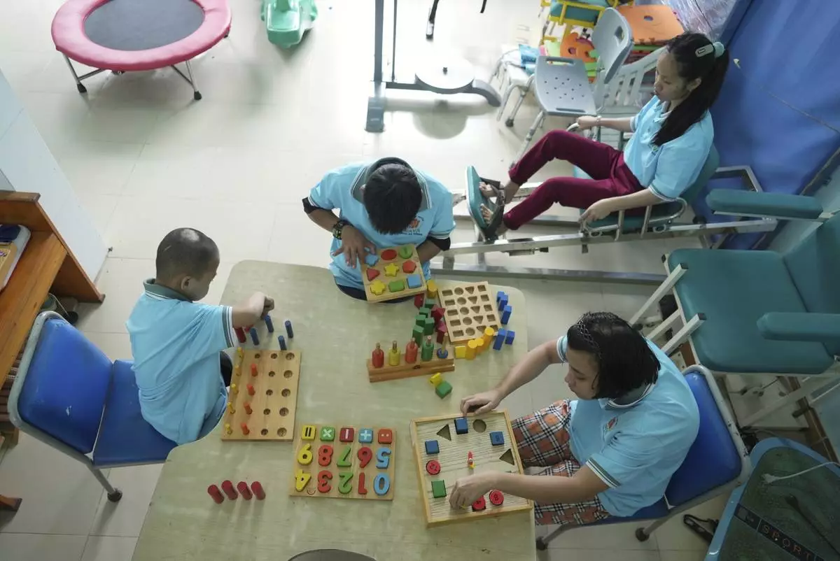 Students exercise and play with wooden blocks in physiotherapy class at a school for victims of Agent Orange in Da Nang, Vietnam, March 7, 2025. (AP Photo/Hau Dinh)