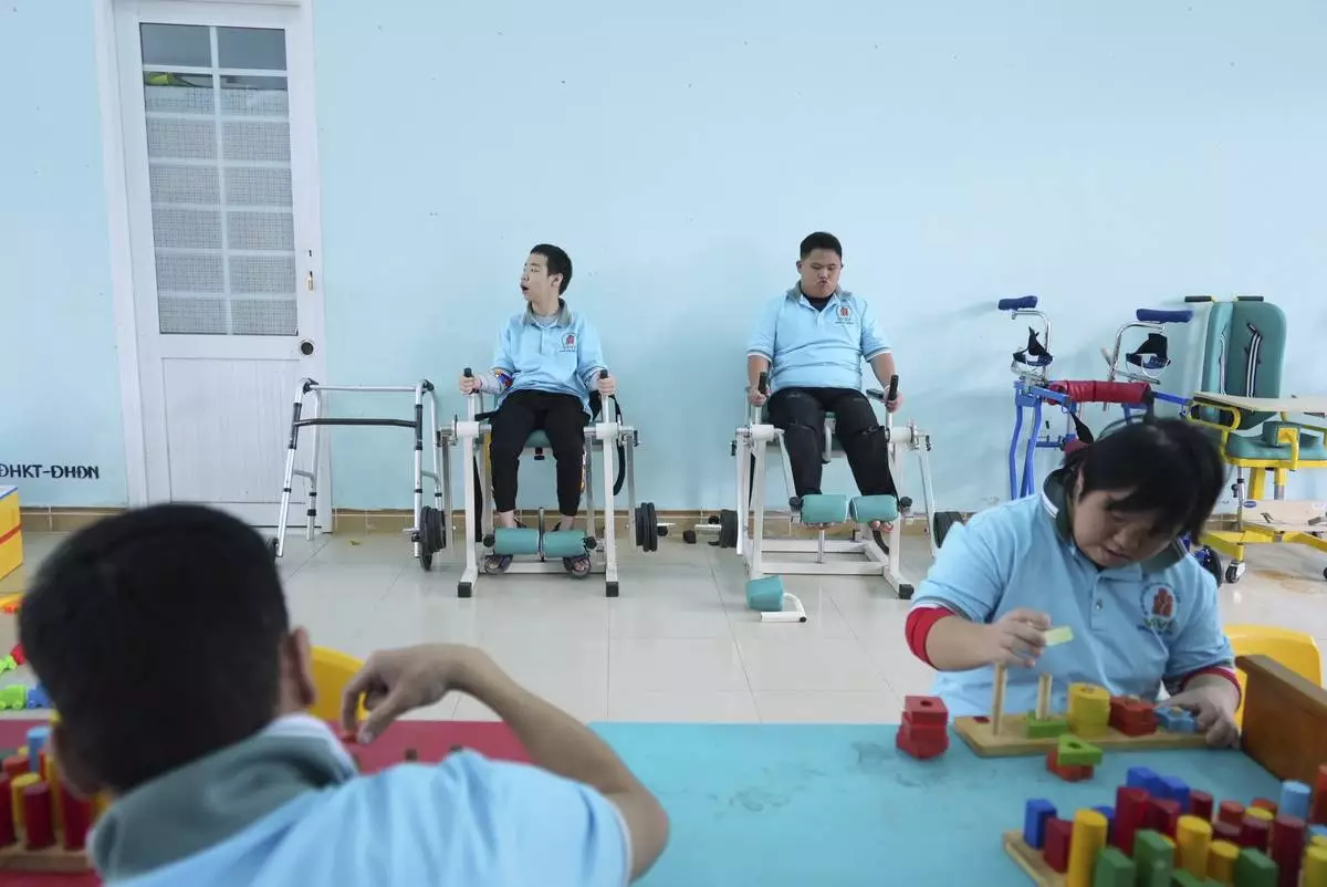 Students attend a physiotherapy class at a school for victims of Agent Orange in Da Nang, Vietnam, March 7, 2025. (AP Photo/Hau Dinh)