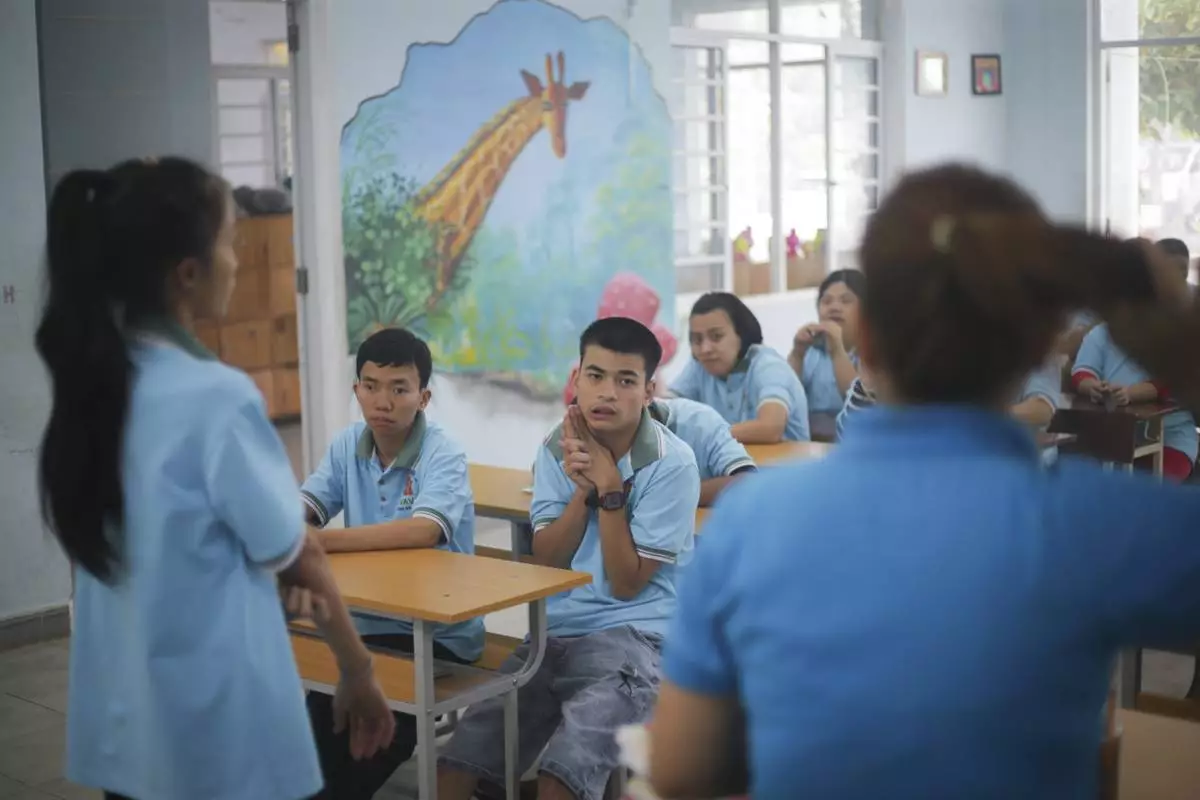 Nguyen Thanh Hai, 34, centre, raises his hand to answer question during class at a school for victims of Agent Orange in Da Nang, Vietnam, March 7, 2025. (AP Photo/Hau Dinh)