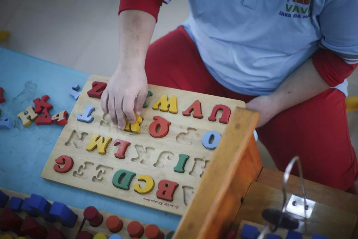A student plays with a wooden shape sorter at a school for victims of Agent Orange in Da Nang, Vietnam, March 7, 2025. (AP Photo/Hau Dinh)