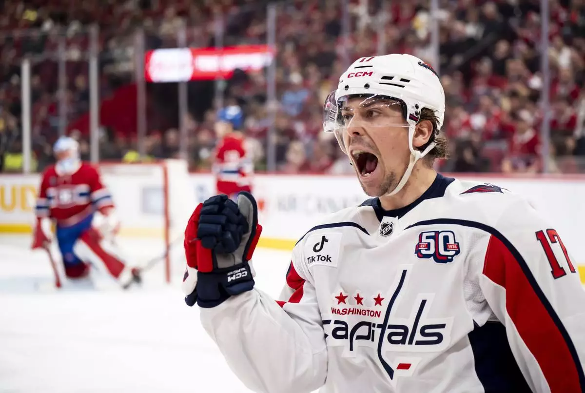 Washington Capitals' Dylan Strome (17) celebrates his goal over the Montreal Canadiens during the second period of an NHL playoff game in Montreal, Sunday, April 27, 2025. (Christinne Muschi/The Canadian Press via AP)