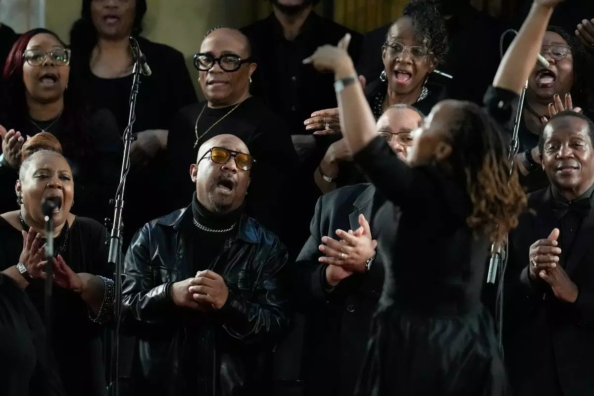 A choir sings during the Homegoing Celebration of Life for the Rev. Jesse Jackson, Saturday, March 7, 2026, at Rainbow PUSH Coalition headquarters in Chicago. (AP Photo/Erin Hooley)