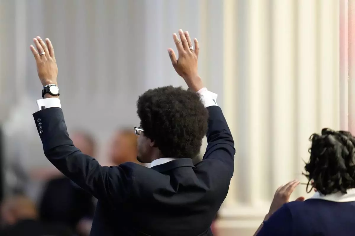 A person celebrates during the Homegoing Celebration of Life for the Rev. Jesse Jackson, Saturday, March 7, 2026, at Rainbow PUSH Coalition headquarters in Chicago. (AP Photo/Erin Hooley)