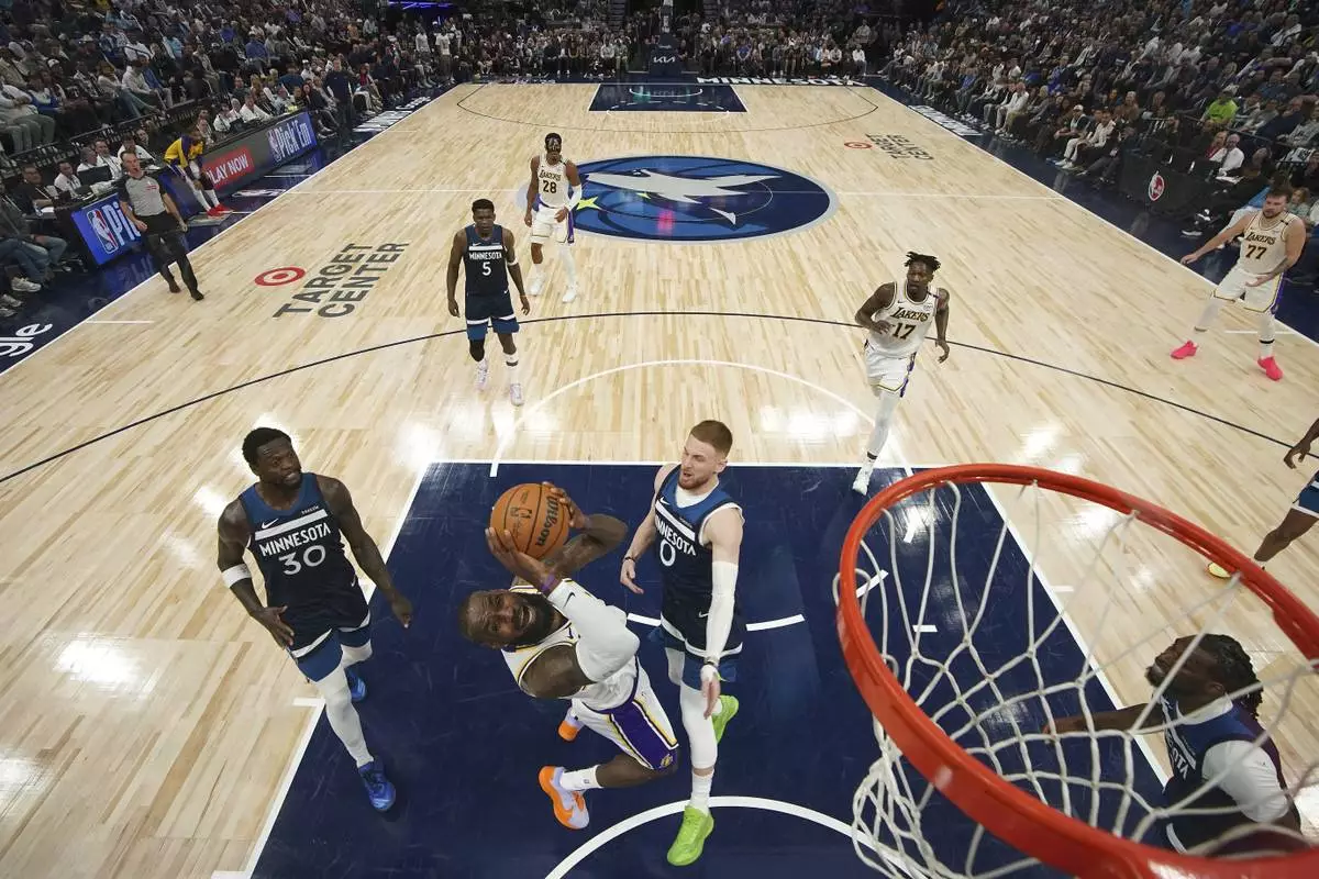 Los Angeles Lakers forward LeBron James, second from bottom left, goes up to shoot as Minnesota Timberwolves guard Donte DiVincenzo (0) defends during the first half of Game 4 of an NBA basketball first-round playoff series, Sunday, April 27, 2025, in Minneapolis. (AP Photo/Abbie Parr)