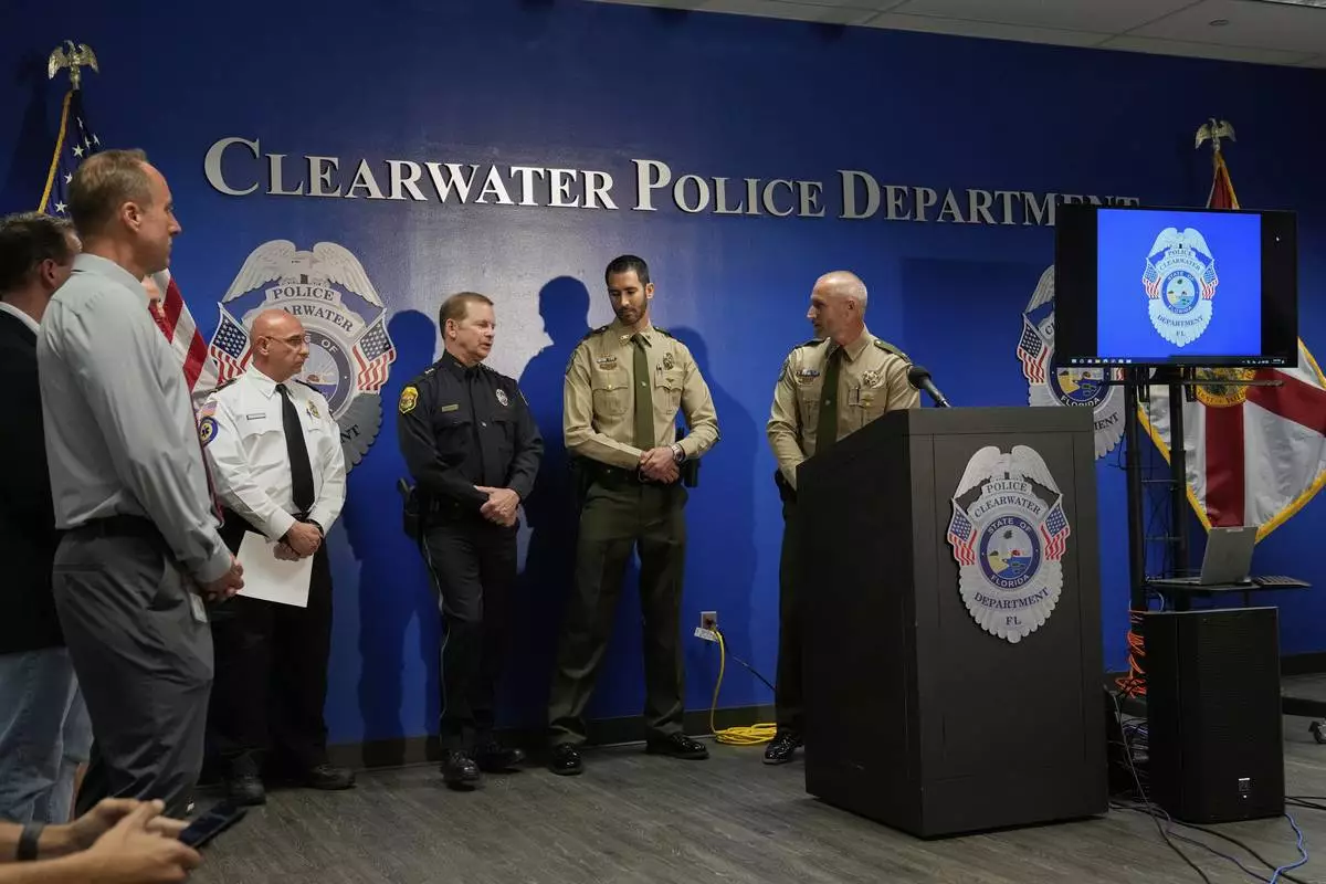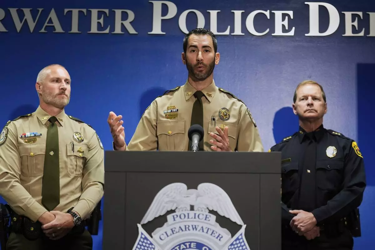 Matthew Dallarosa, center, of the Florida Fish and Wildlife Conservation Commission, flanked by Evan Laskowski, left, also of FWC, and Clearwater, Fla., Police Chief Eric Gandy, right, speaks during a news conference Monday, April 28, 2025, in Clearwater, Fla., after a deadly boating accident Sunday night. (AP Photo/Chris O'Meara)