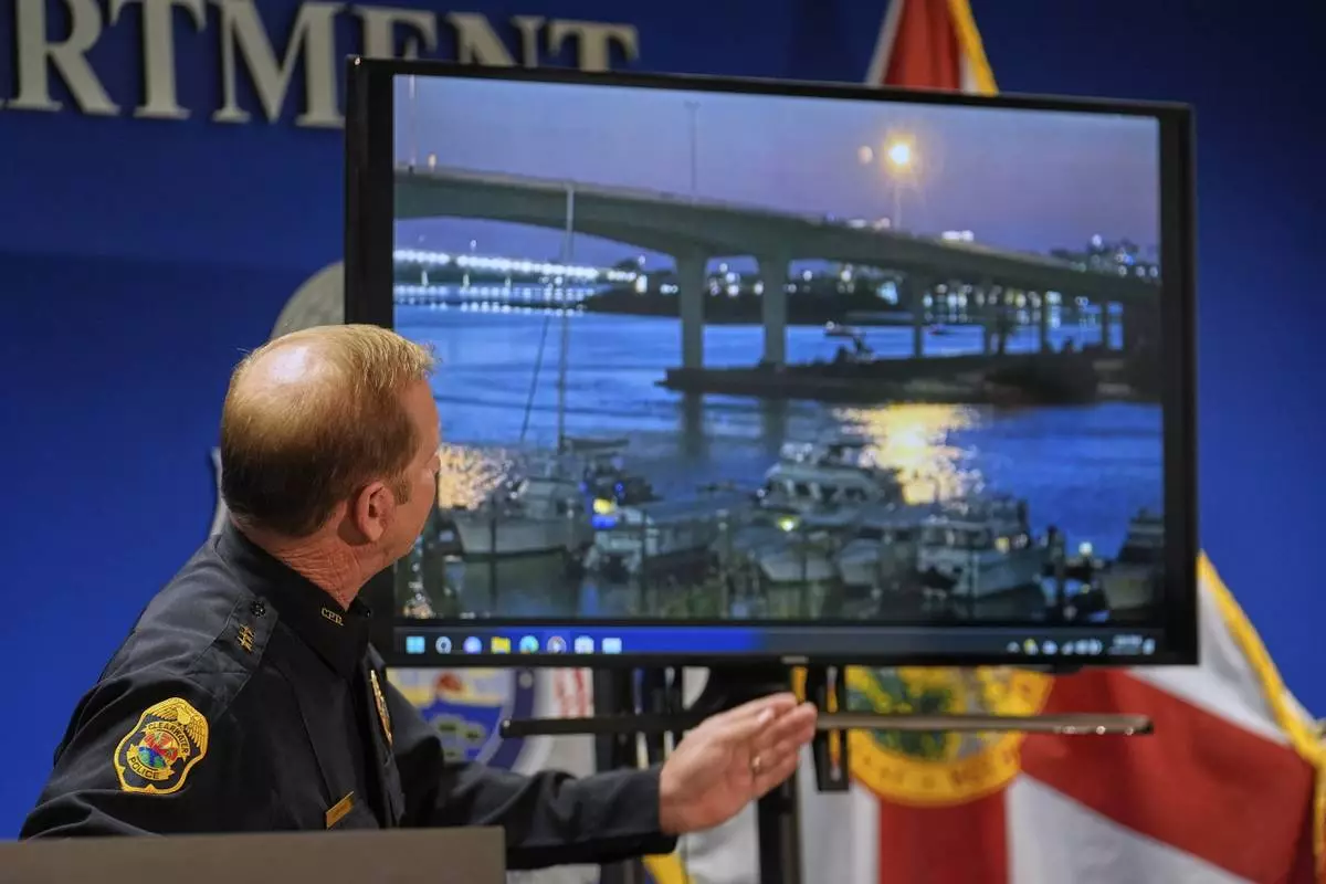 Clearwater, Fla., Police Chief Eric Gandy shows the media a boat crash video that occurred on Sunday night during a news conference Monday, April 28, 2025, in Clearwater, Fla. (AP Photo/Chris O'Meara)