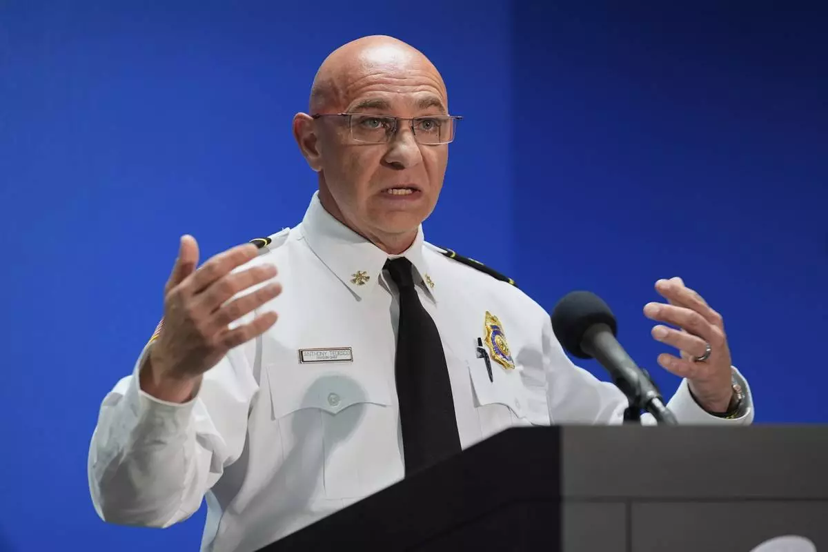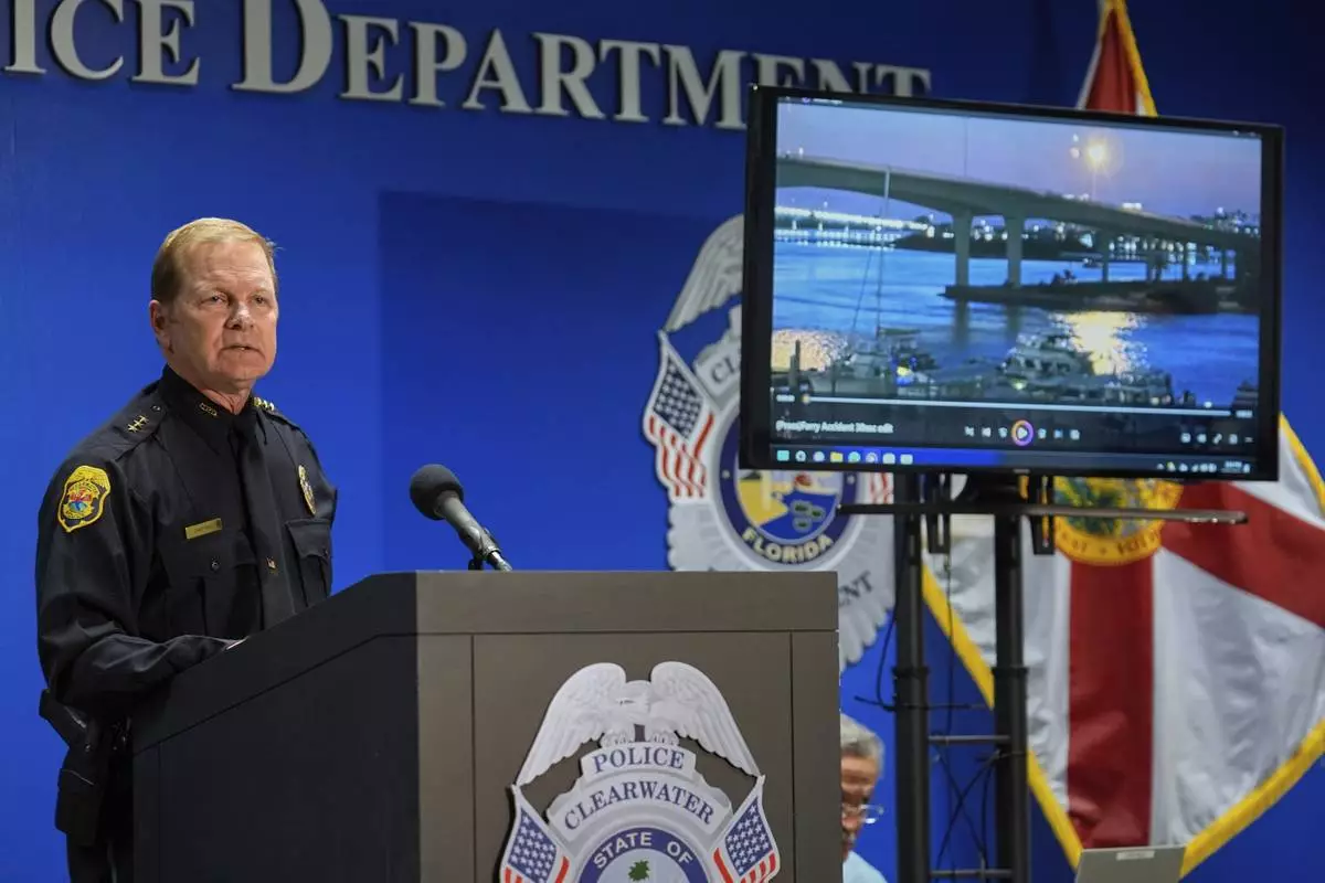 Clearwater, Fla., Police Chief Eric Gandy shows the media a boat crash video during a news conference Monday, April 28, 2025, in Clearwater, Fla., after multiple people were injured in the deadly accident Sunday night. (AP Photo/Chris O'Meara)