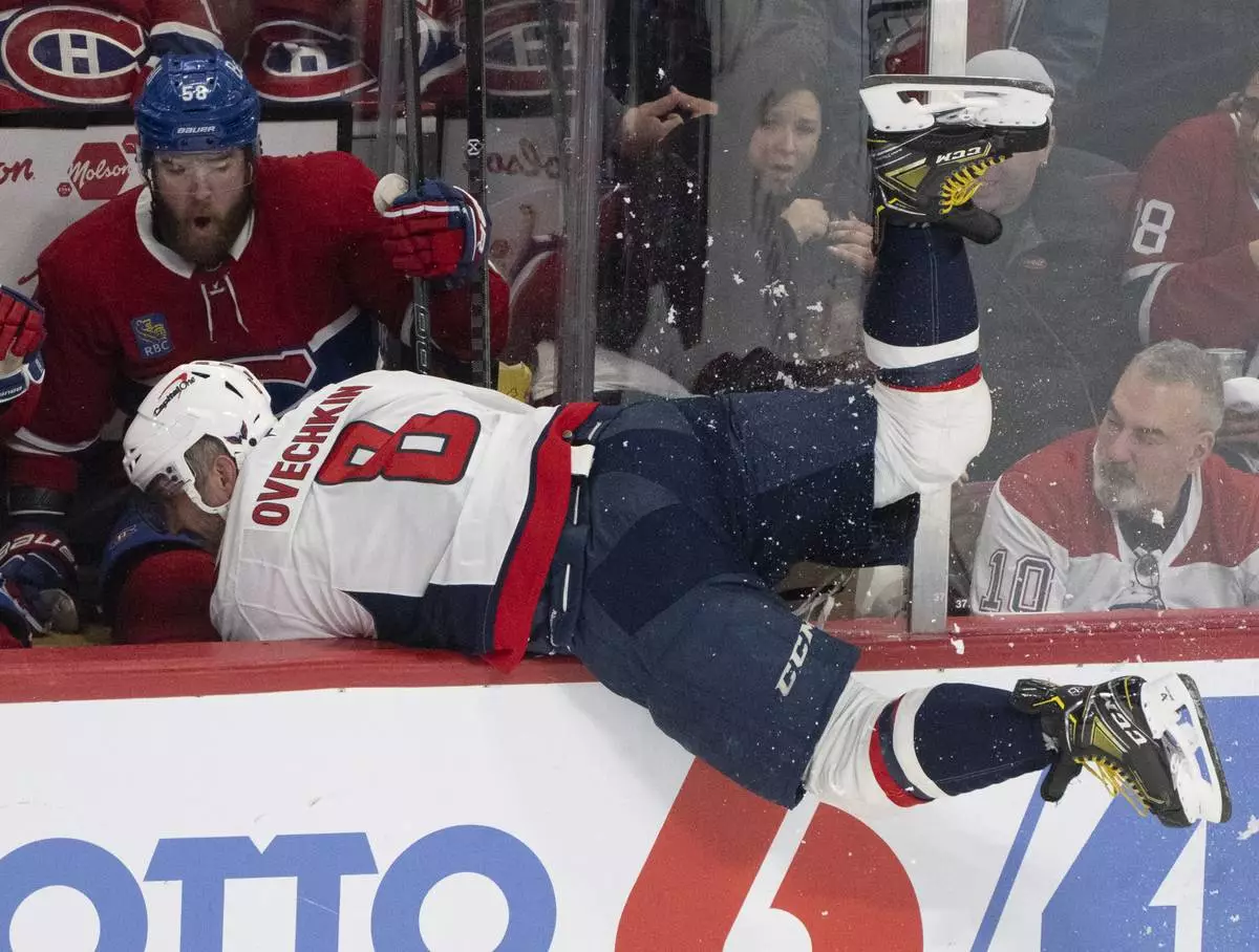 Montreal Canadiens' David Savard (58) reacts as Washington Capitals' Alex Ovechkin (8)falls into the bench during the first period of Game 4 in an NHL hockey first-round playoff series in Montreal, Sunday, April 27, 2025. (Christinne Muschi/The Canadian Press via AP)