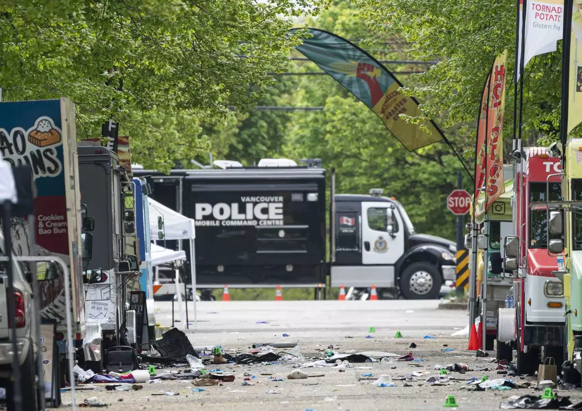 Vancouver police secure the scene after a car drove into a crowd at the Lapu Lapu Festival in Vancouver, British Columbia, Saturday April 26, 2025. (Rich Lam/The Canadian Press via AP)