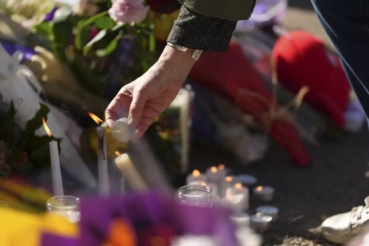 A person lights a candle at a memorial after a vehicle drove into a crowd during a Filipino heritage festival in Vancouver, British Columbia, Sunday, April 27, 2025. (AP Photo/Lindsey Wasson)