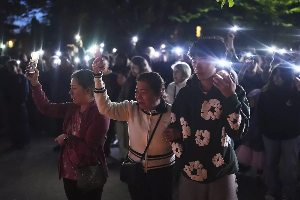 From left, Glenda Ahyeng, sister Liza Ahyeng and Shane Ahyeng hold cell phone lights during a vigil for victims after a vehicle drove into a crowd during a Filipino heritage festival in Vancouver, British Columbia, Sunday, April 27, 2025. (AP Photo/Lindsey Wasson)