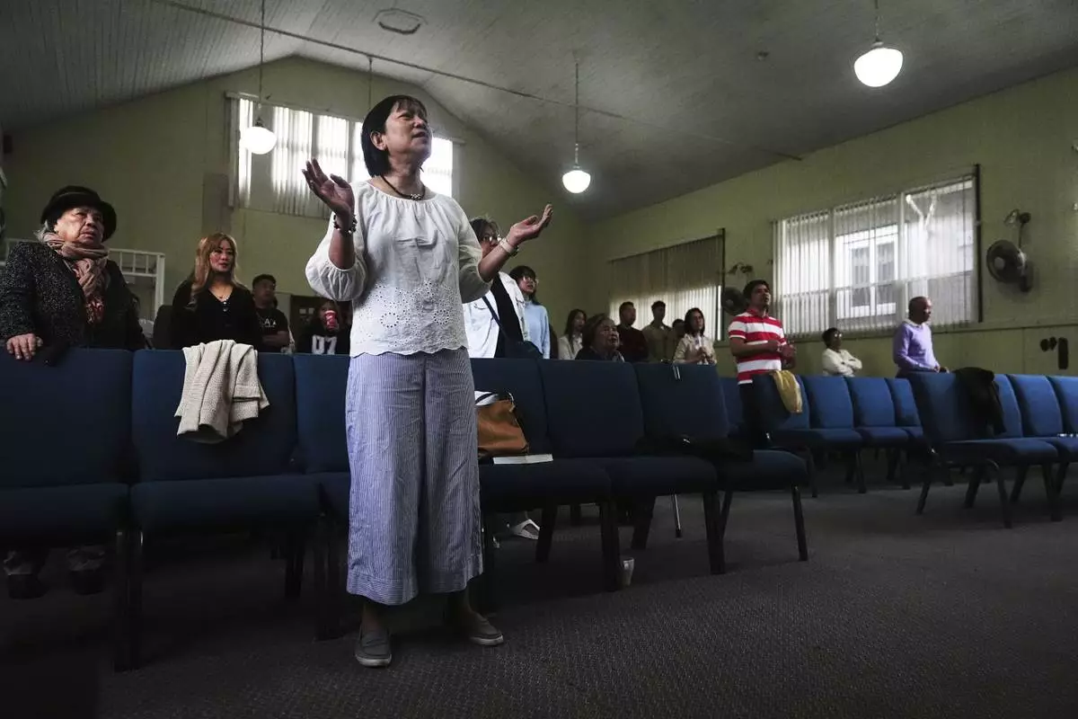 Adonis Quita, center, who witnessed the event, sings during a worship service at the Filipino Fellowship Baptist Church the day after a driver killed multiple people during a Filipino community festival Sunday, April 27, 2025, in Vancouver, British Columbia. (AP Photo/Lindsey Wasson)