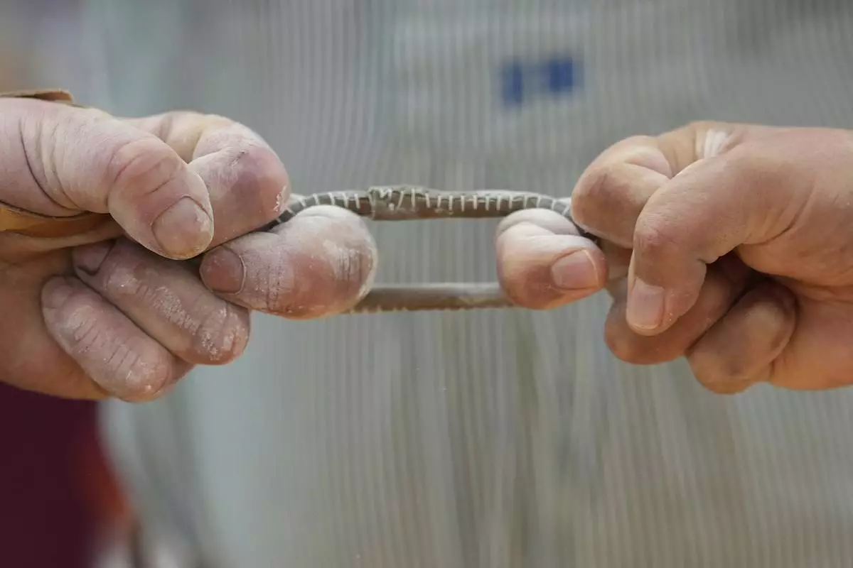 A competitor warms up for his bout while he try to pull the opponent over the table at the German Championships in Fingerhakeln or finger wrestling, in Pang, near Rosenheim, Germany, Sunday, April 27, 2025. (AP Photo/Matthias Schrader)