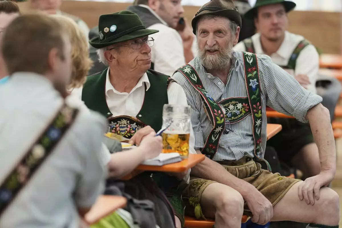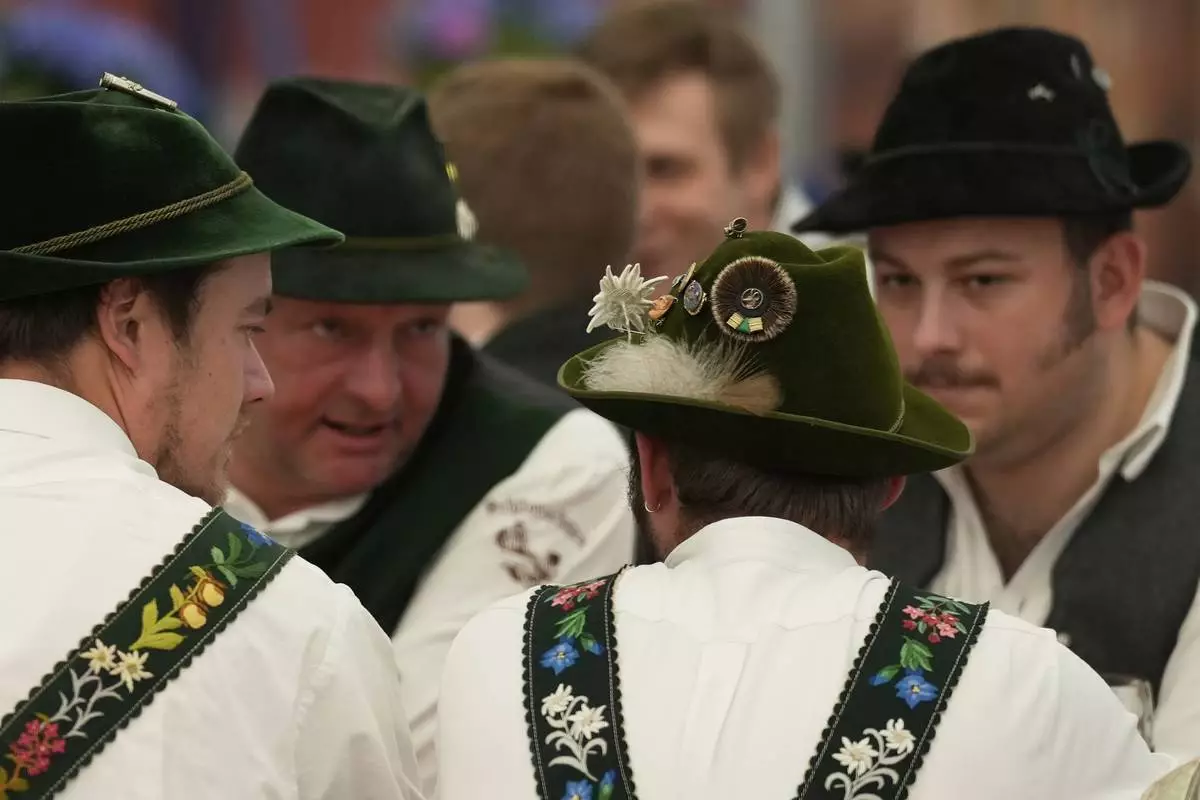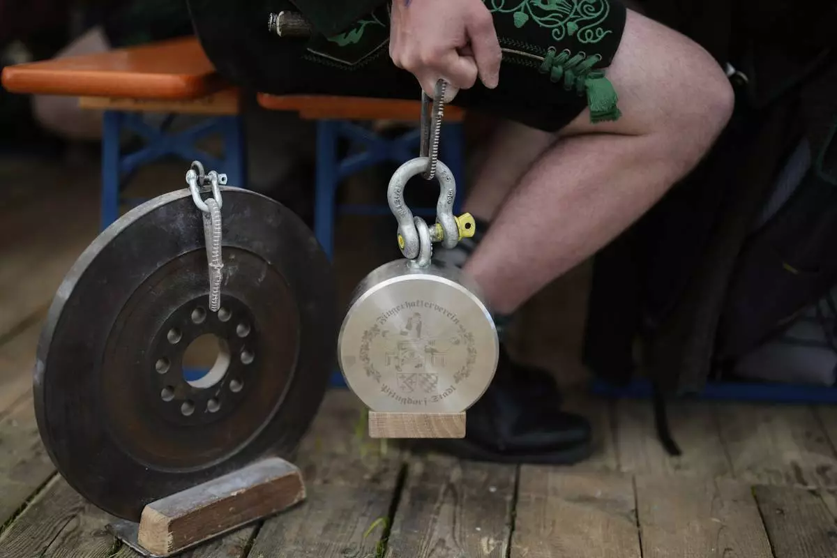 Men dressed in traditional clothes attend the German Championships in Fingerhakeln or finger wrestling, in Pang, near Rosenheim, Germany, Sunday, April 27, 2025. (AP Photo/Matthias Schrader)