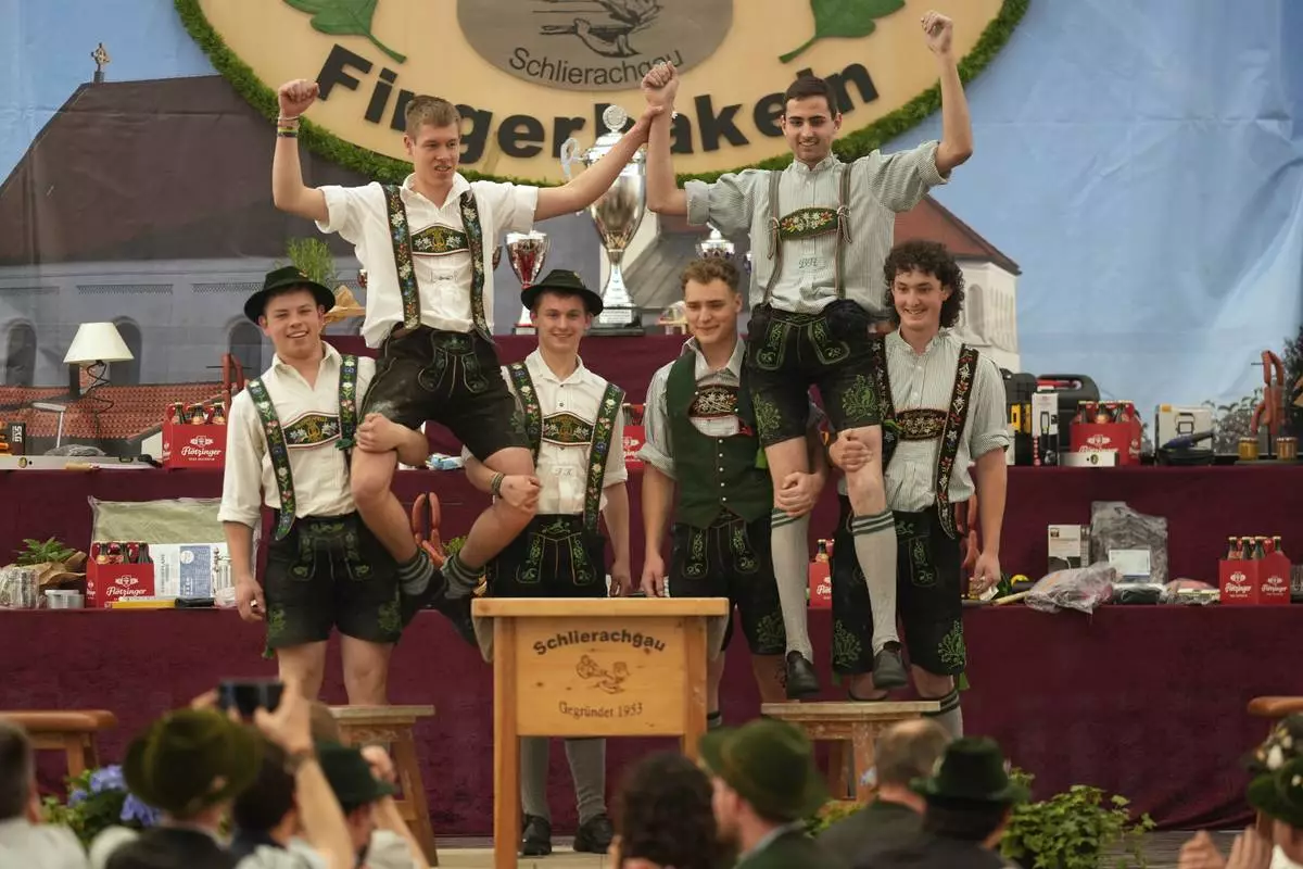 Competitors celebrates after their bouts while they try to pull the opponents over the table at the German Championships in Fingerhakeln or finger wrestling, in Pang, near Rosenheim, Germany, Sunday, April 27, 2025. (AP Photo/Matthias Schrader)