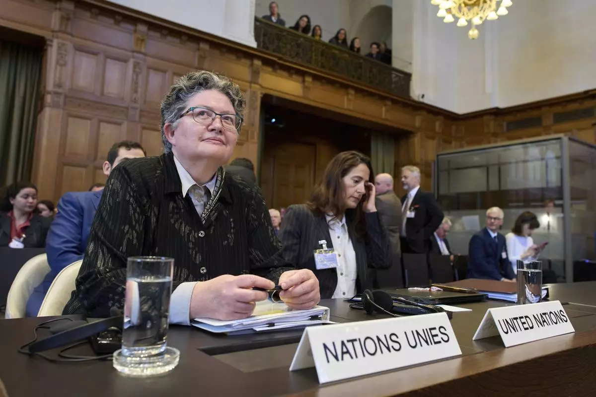 Elinor Hammarskjold, head of the UN legal team, waits to speak at the International Court of Justice, which opened hearings into a United Nations request for an advisory opinion on Israel's obligations to allow humanitarian assistance in Gaza and the West Bank, in The Hague, Netherlands, Monday, April 28, 2025. (AP Photo/Peter Dejong)