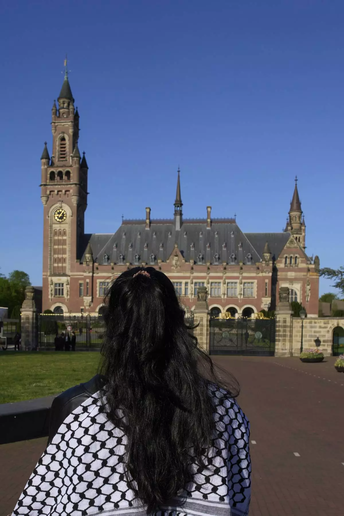 A woman wearing a keffieh stands in front of the International Court of Justice which opens hearings into a United Nations request for an advisory opinion on Israel's obligations to allow humanitarian assistance in Gaza and the West Bank, in The Hague, Netherlands, Monday, April 28, 2025. (AP Photo/Peter Dejong)