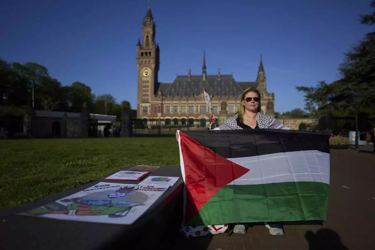 FILE - A lone demonstrator waves the Palestinian flag outside the Peace Palace, rear, housing the International Court of Justice, or World Court, in The Hague, Netherlands, on May 24, 2024. (AP Photo/Peter Dejong, File)