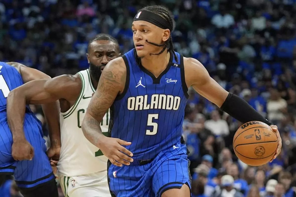 Orlando Magic forward Paolo Banchero (5) drives past Boston Celtics guard Jaylen Brown, left, during the second half in Game 4 of a first-round NBA basketball playoff series, Sunday, April 27, 2025, in Orlando, Fla. (AP Photo/John Raoux)