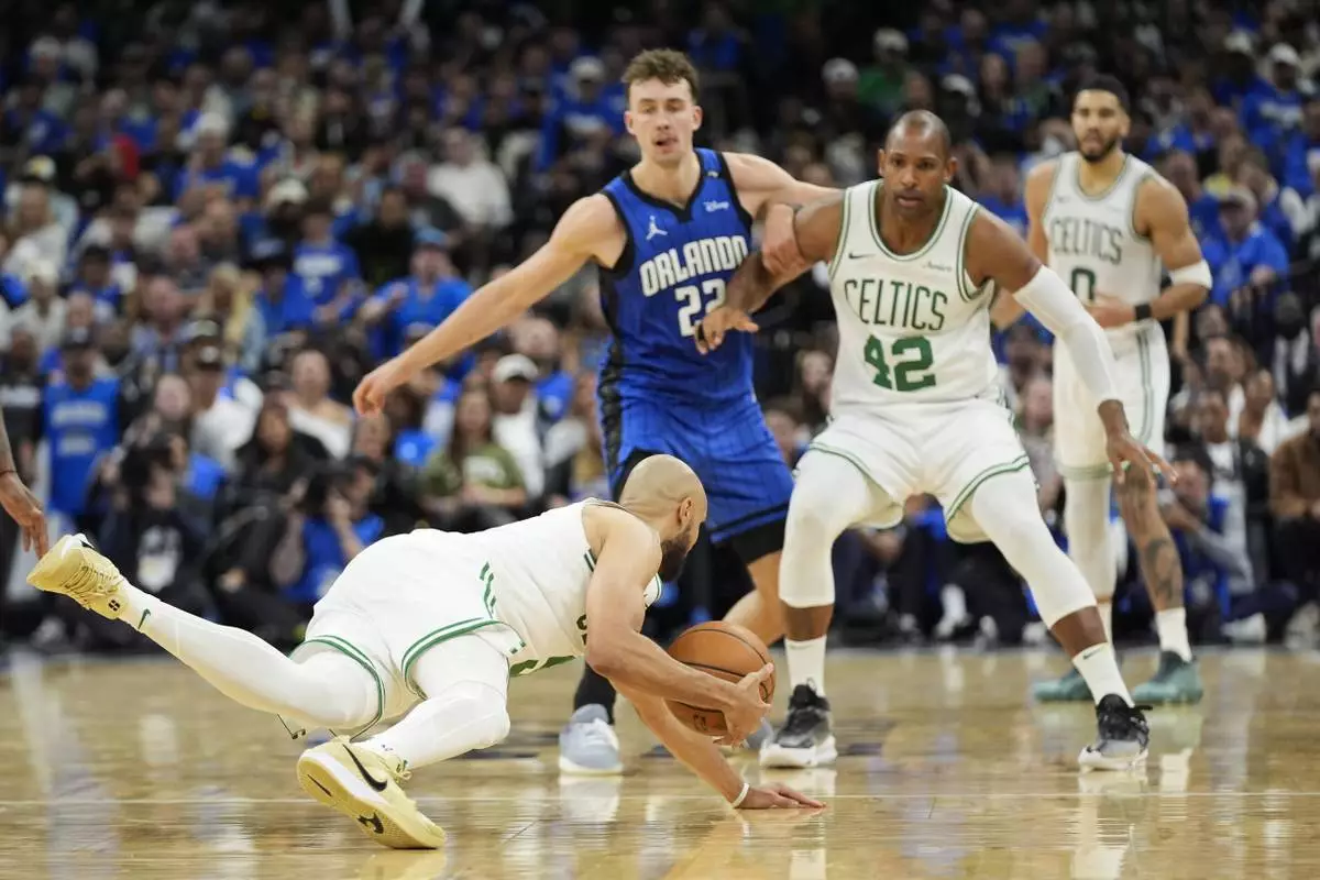 Boston Celtics guard Derrick White, left, falls in front of Orlando Magic forward Franz Wagner (22) and center Al Horford (42) as he moves the ball downcourt during the second half in Game 4 of a first-round NBA basketball playoff series, Sunday, April 27, 2025, in Orlando, Fla. (AP Photo/John Raoux)