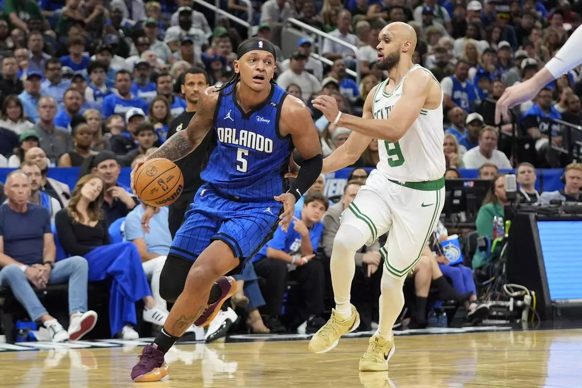 Orlando Magic forward Paolo Banchero (5) drives around Boston Celtics guard Derrick White (9) during the second half in Game 4 of a first-round NBA basketball playoff series, Sunday, April 27, 2025, in Orlando, Fla. (AP Photo/John Raoux)