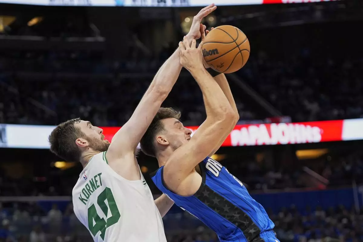 Orlando Magic forward Franz Wagner, right, loses control of the ball as he goes up against Boston Celtics center Luke Kornet (40) during the second half in Game 4 of a first-round NBA basketball playoff series, Sunday, April 27, 2025, in Orlando, Fla. (AP Photo/John Raoux)