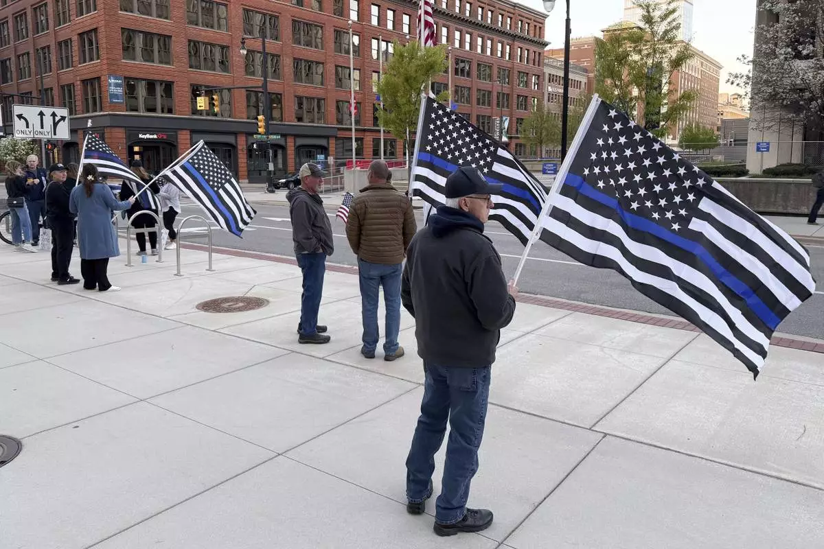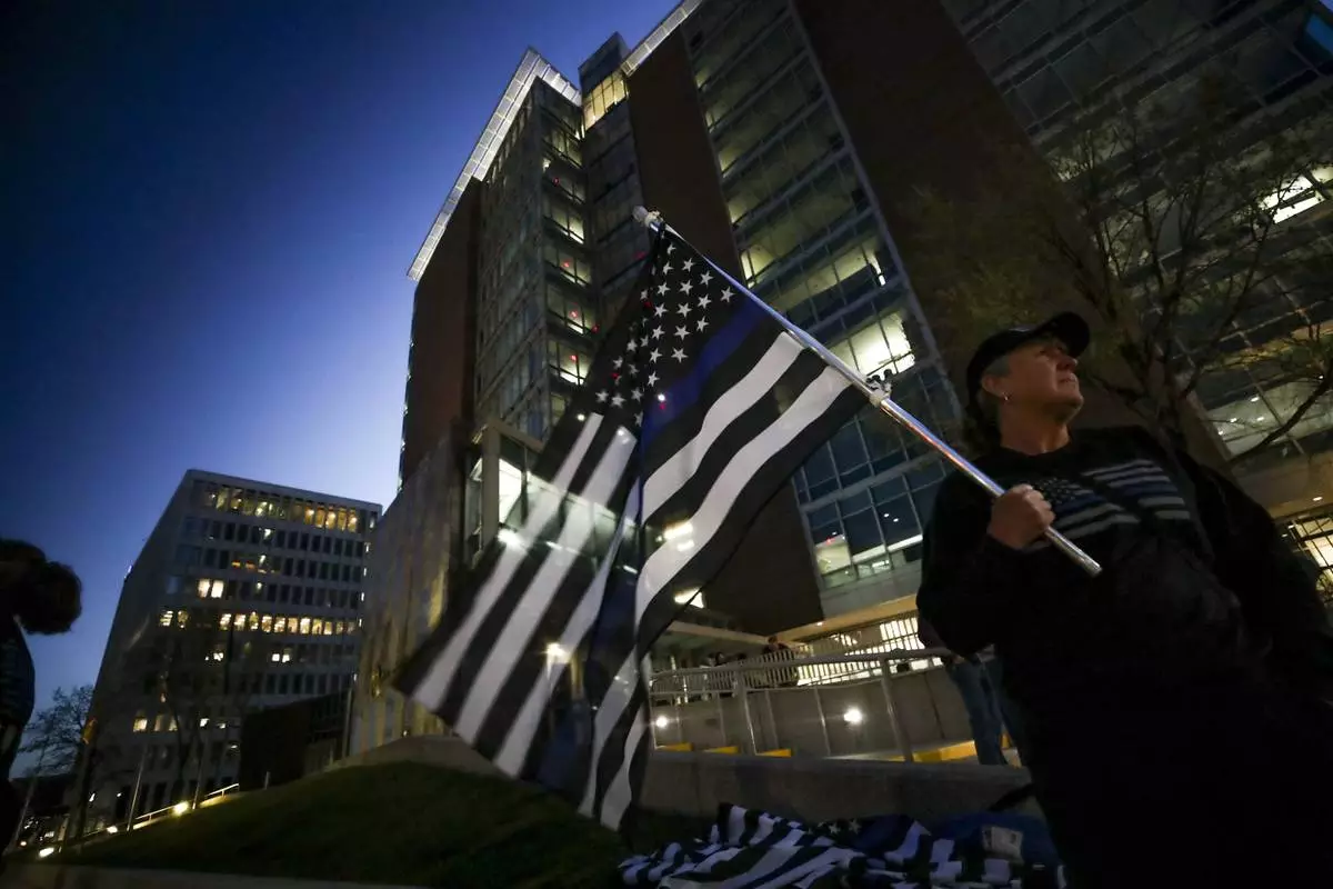 Sally R. of Holland holds a "blue line" flag outside the Kent County Courthouse on the first day of testimony in the 2nd degree murder trial of former Grand Rapids City Police officer Christopher Schurr on April 28, 2025 in Grand Rapids, MI. Schurr shot and killed Congolese immigrant Patrick Lyoya during a traffic stop three years ago. (Chris duMond/Detroit News via AP)