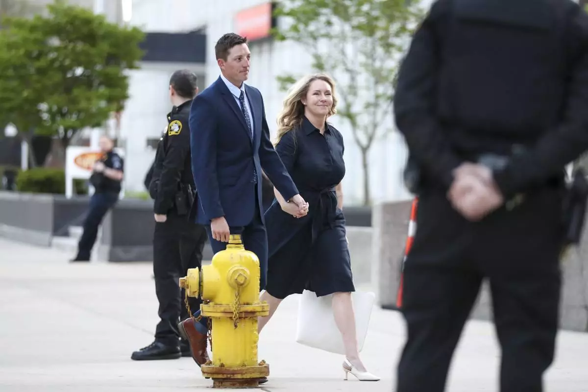 Former Grand Rapids City Police officer Christopher Schurr and wife Brandey arrive outside the Kent County Courthouse on the first day of testimony in his 2nd degree murder trial in Grand Rapids, Mich., Monday, April 28, 2025. (Chris duMond/Detroit News via AP)
