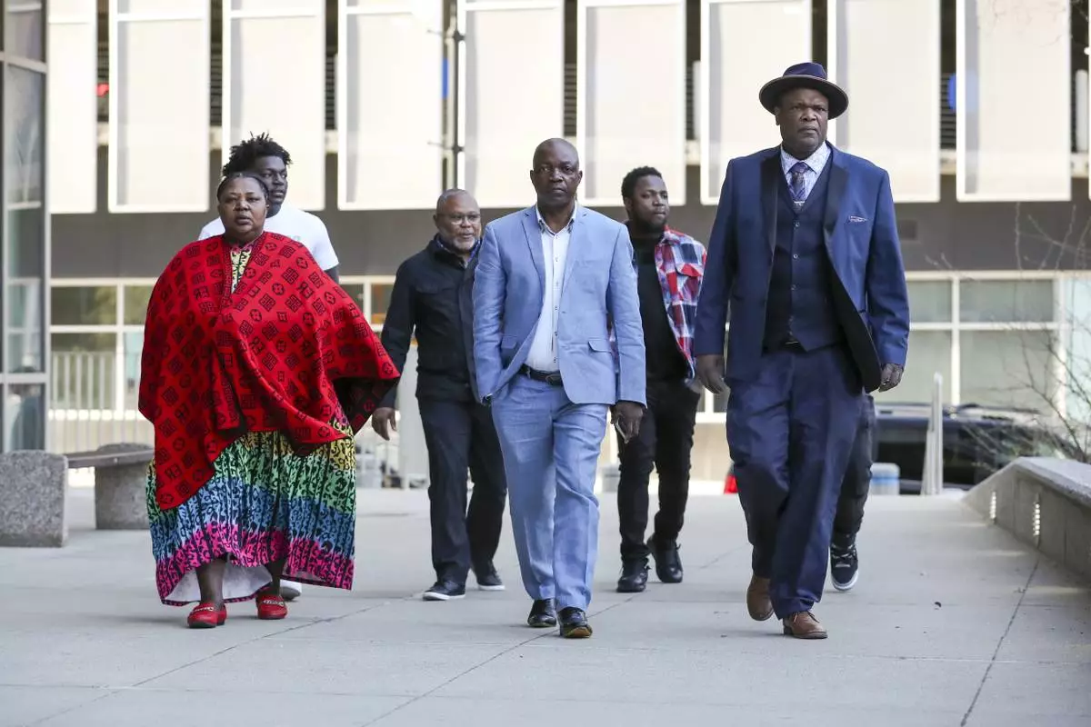 The family of Patrick Lyoya and Kent County commissioner Robert Womack, right, arrive outside the Kent County Courthouse in Grand Rapids, Mich., Monday, April 28, 2025. (Chris duMond/Detroit News via AP)