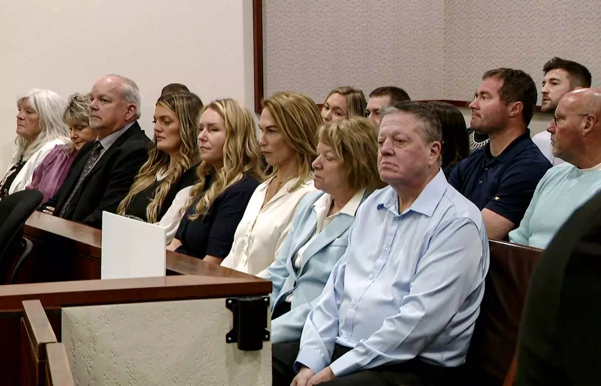 This image made from video provided by WOOD-TV shows Christopher Schurr's family members and supporters sitting in court at the Kent County Courthouse in Grand Rapids, Mich., on the first day of his trial, Monday, April 28, 2025. (WOOD-TV via AP, Pool)